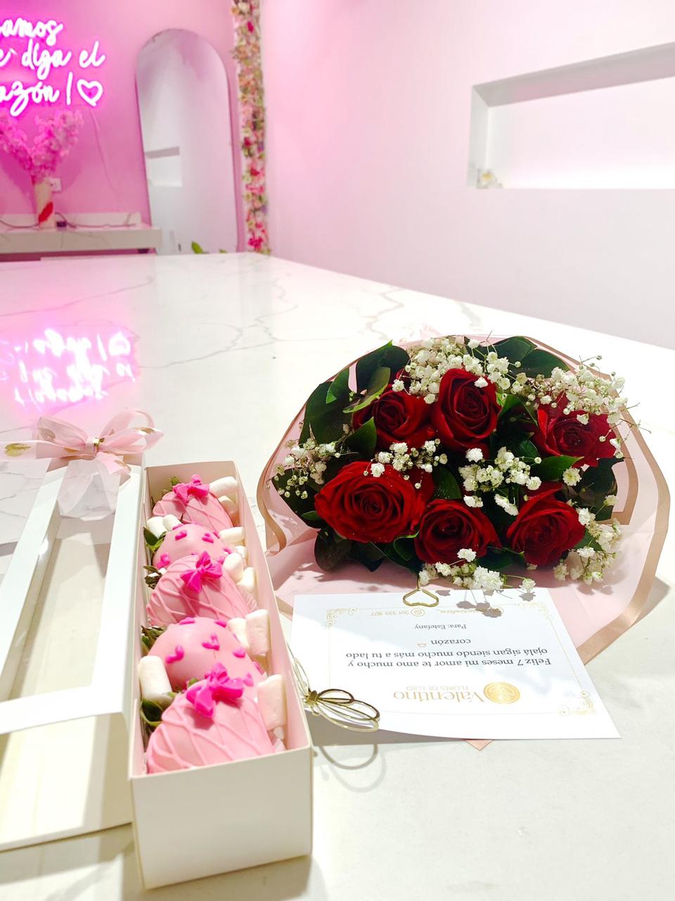 Hermoso combo de rosas y caja x5 fresas tamaño jumbo decoradas con delicioso chocolate