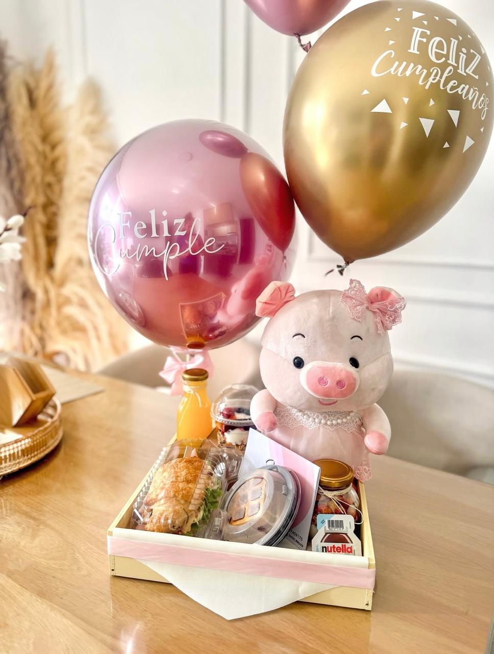 Contiene: Sandwhich de jamón y queso, waffles, parfait saludable, mix de frutas, nutella, jugo natural, peluche (Preguntar por los disponibles) , globo burbuja personalizado, 2 globos en helio, decoración de caja, cubiertos, galleta.