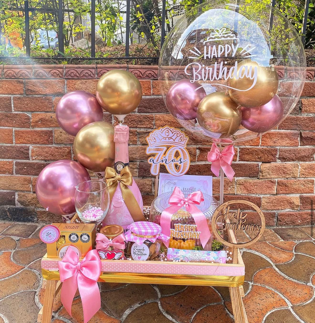 Contiene: Jp grande - ferrero x4 - copa - mani en envase de vidrio - galletas en envase de vidrio - torta o tabla de quesos, decoración de caja, globos reflex y globo burbuja personalizado