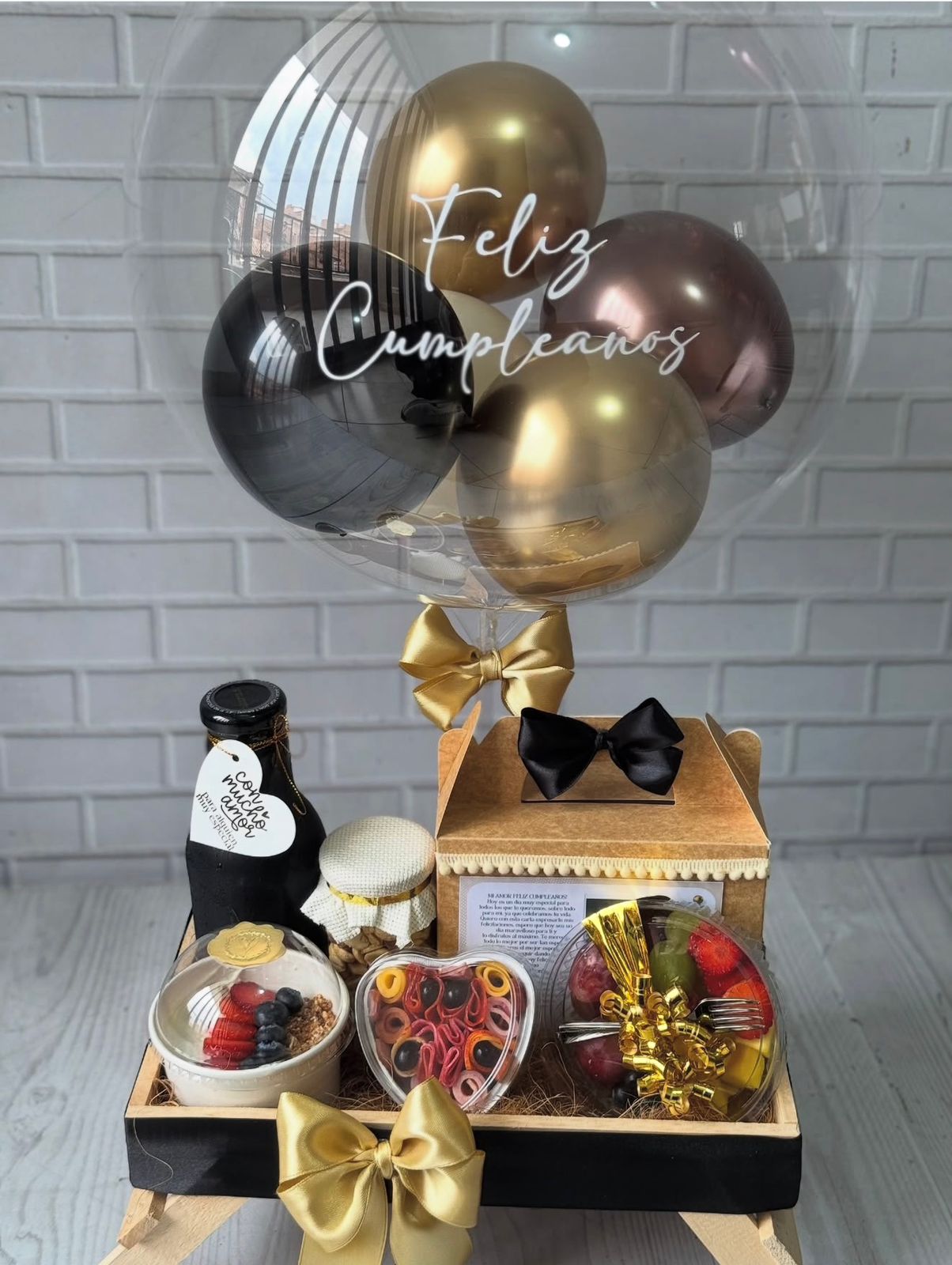 Contiene: Torta - Te hatsu - mix de fruta - parfait saludable - rollitos de jamón, peperoni y queso, frutos secos - decoración de caja y globo burbuja con globos reflex