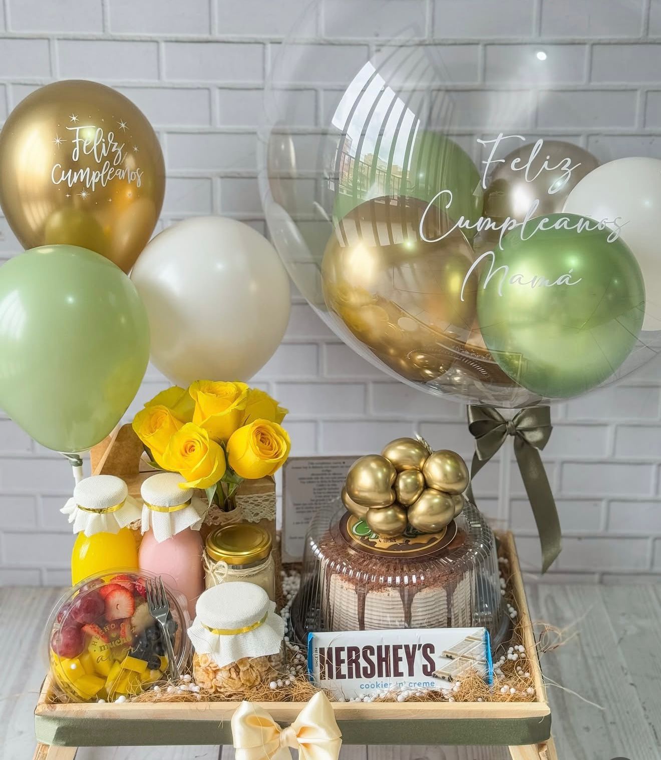 Contiene: Jugo natural - Yogurt de fresa - Torta mediana - Mix de frutas - Chocolates M&M's o Hersheys - Frutos secos - Rosas - Decoraciòn de caja, globos reflex y globo burbuja