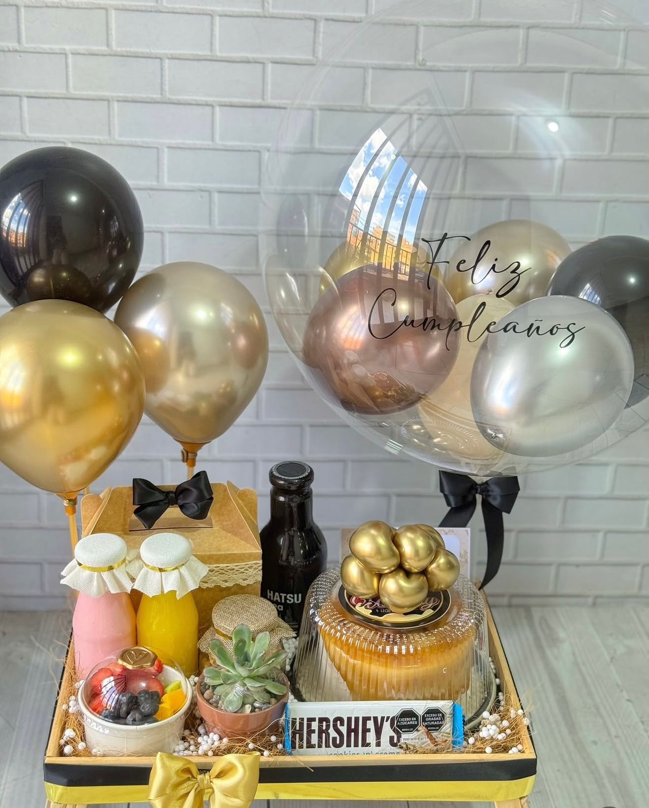 Contiene: Jugo natural - Yogurt de fresa - Torta mediana - Mix de frutas - Chocolates M&M's o Hersheys - Frutos secos - Sandwhich de polllo - Té hatsu - Planta - Decoraciòn de caja, globos reflex y globo burbuja