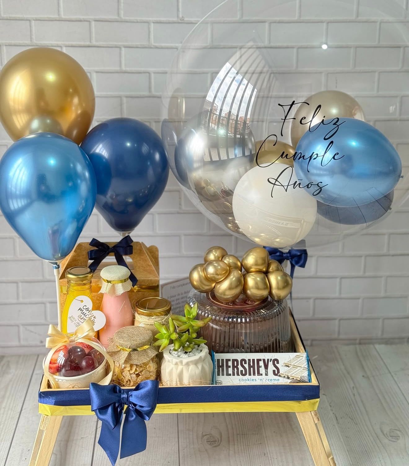 Contiene: Jugo natural - Yogurt de fresa - Sandwhich de pollo - Torta mediana de chocolate - Mix de frutas - Frutos secos - Chocolates M&M's o Hersheys - Planta - Decoración de caja, globos reflex y globo burbuja personalizado