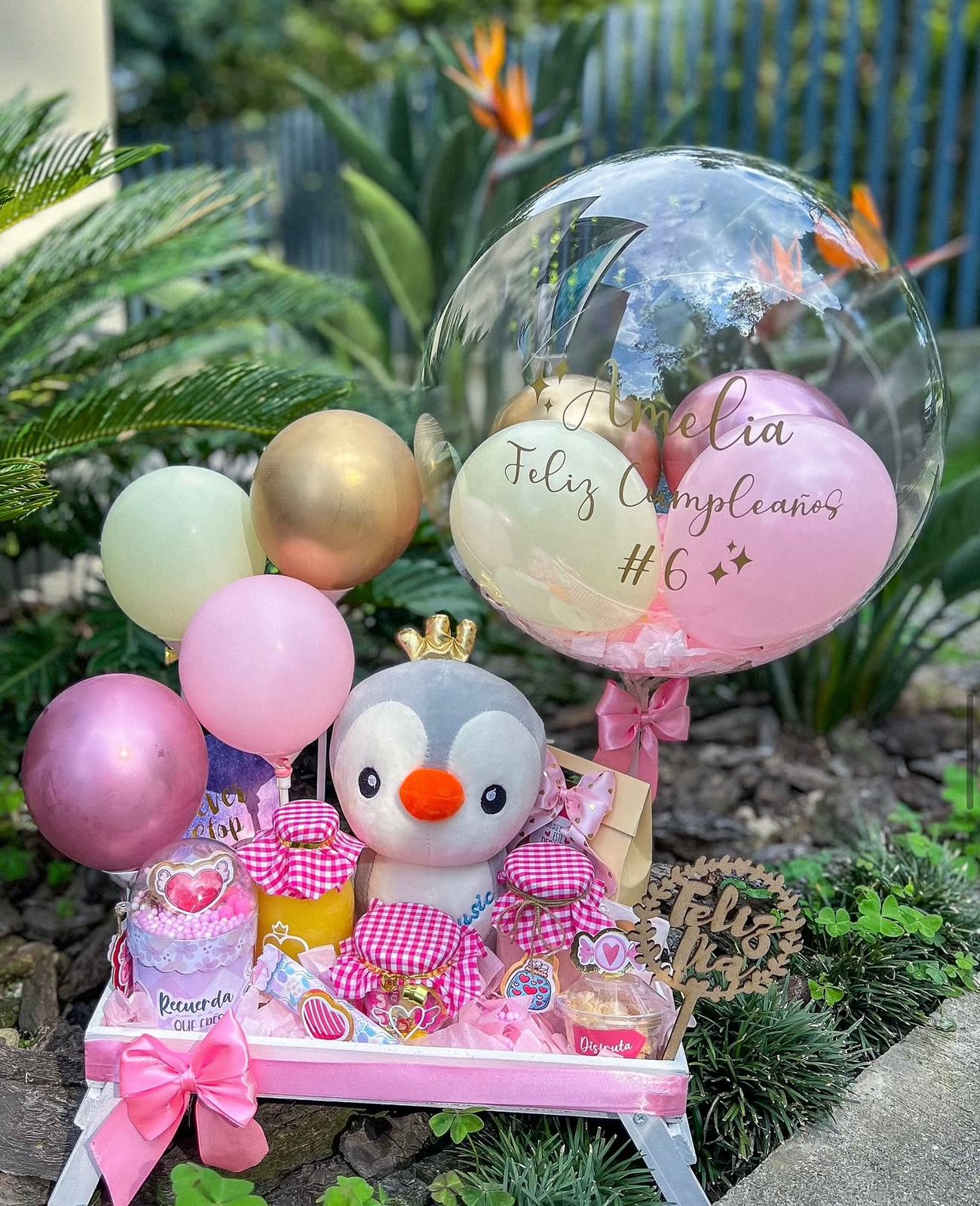 Contiene : Jugo natural - Vaso decorativo - Peluche (Revisar opciones disponibles) - Yogurt de fresa - Vaso de gomitas - Sandwhich de pollo - Mix de frutos secos - Decoración de caja, globox reflex, y globo burbuja personalizado