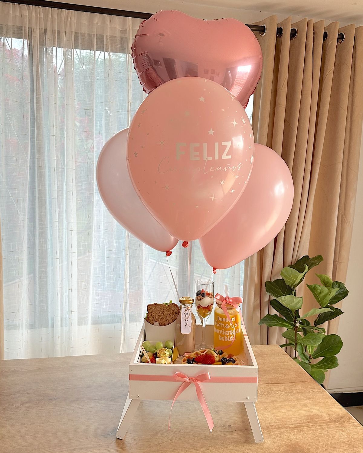 Incluye: Jugo de naranja,sandwhich tipo croassant con jamón y queso, parfait saludable en copa de vidrio, mix de frutas, Waffles con fruta, 4 globos en helio.