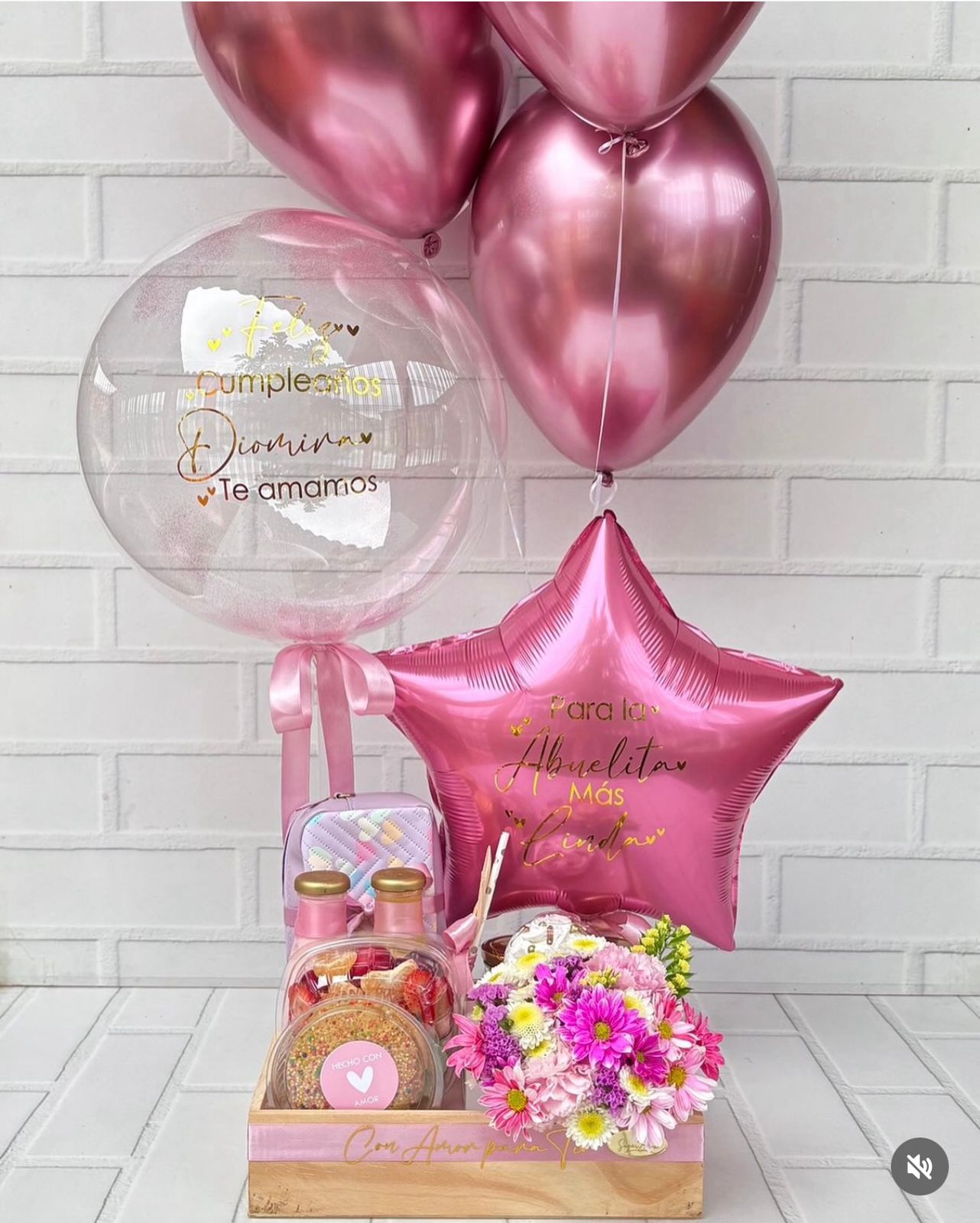 Hermoso desayuno sorpresa contiene: Jugo natural, yogurt de fresa, sandwhich mix de frutas, waffles, maní, galleta, globo burbuja personalizado, globo metalizado, 3 globos en helio, arreglo floral con variedad de flores.