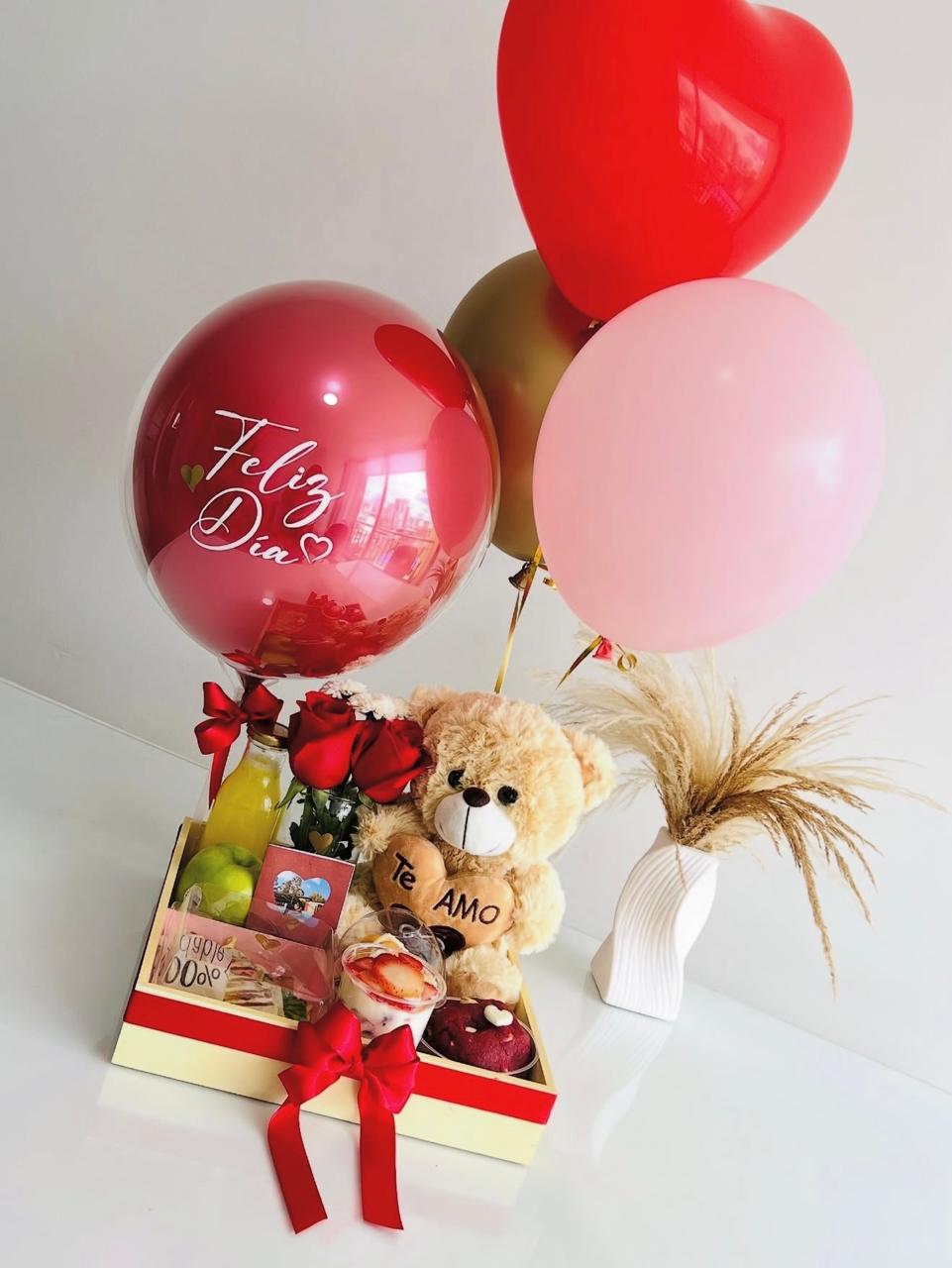 Contiene: Waffles, parfait saludable, cupcake, jugo natural, manzana, rosas, peluche de 25 cm (Preguntar opciones disponibles) Globo burbuja personalizado, 3 globos en helio, decoración caja.