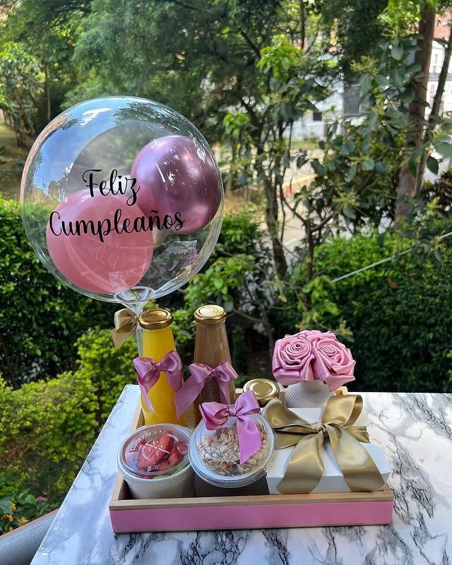 Incluye: Jugo de naranja, Milo frío, sandwhich de pollo, parfait saludable, galletas, mix de frutas, 3 Rosas eternas, globo burbuja personalizado con globos réflex, caja decorada.