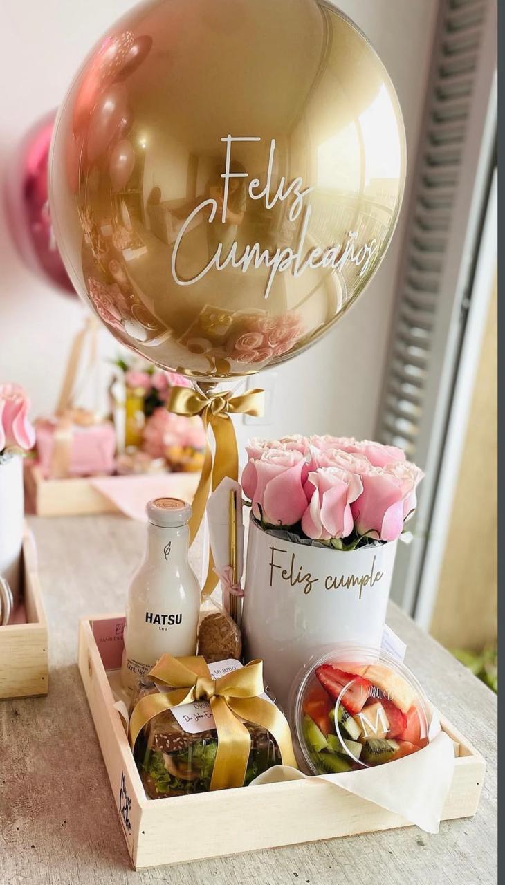 Contiene: Té hatsu, sandwhich de pollo, mix de frutas, ramo de base x6 rosas