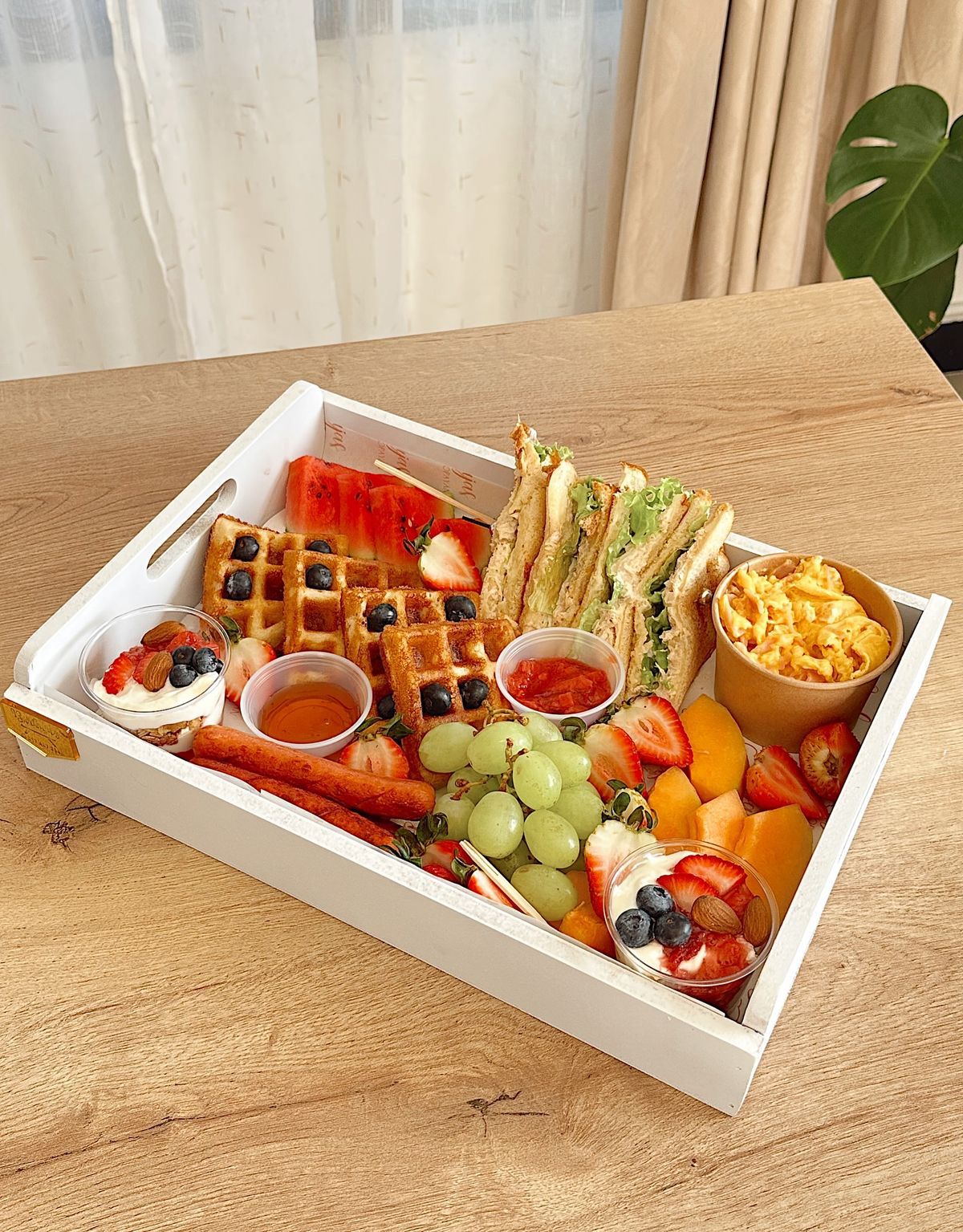 Incluye: Waffles, mix de frutas, parfait saludable, salchichas, sandwhich de pollo, galletas, maní salado.